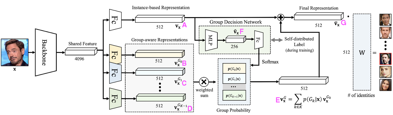 그 instance-based 표현은 재래식 얼굴 인식 방법에 [7일 34,35,44], Kgroup-aware 표현은 fullyconnected 계층을 구축 하면 사용되는 동일한 절차에 의해 얻어진 것이다. 이후, 이 그룹 가능성은 instance-based 표현 벡터에서 열린 그룹 의사 결정 네트워크(GDN)세 가지 fully-connected 층과 softmax 계층으로 구축하여 계산된다. 그룹 가능성을 이용해서, 여러 group-aware 부드러운 태도(S-GroupFace)또는 힘든 태도(H-GroupFace)에 sub-ensembled 있다.