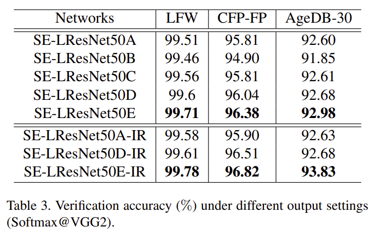 옵션 E(BN-Dropout-FC-BN)는 최상의 성능을 제공한다. 본 논문에서는 드롭아웃 매개변수가 0.4로 설정된다. Dropout over-fitting을 방지하고 심층 얼굴 인식을 위한 더 나은 일반화를 얻기 위해 정규화를 효과적으로 작용할 수 있다.