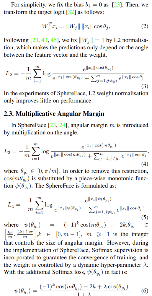 Sphere Face cos(m²)는 가중치 정규화를 통해 심층 얼굴 인식에 L-Softmax를 적용한다. 코사인 함수의 비 일원 성 때문에, Sphere Face에서 조각 별 함수를 적용하여 단조성을 보장한다. Sphere Face 훈련 중 Softmax 손실은 수렴을 촉진하고 보장하기 위해 결합된다. 최적화 어려움을 극복하기 위해 추가 코사인 여백 cos(α)-m은 각도 여백을 코사인 공간으로 이동시킨다. 코사인 마진의 구현과 최적화는 Sphere Face보다 훨씬 쉽고, 수월히 재현할 수 있으면서도 MegaFace에서 최첨단 성능을 달성한다.