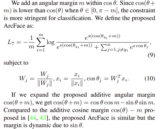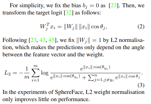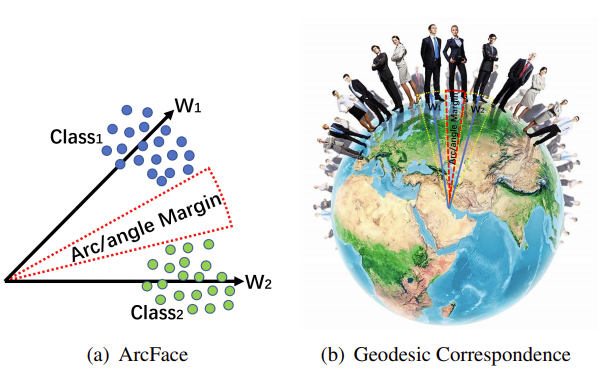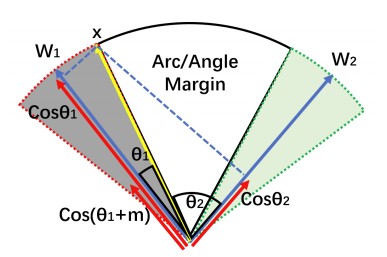 Facecnn v1, Additive margin softmax for face verification의 코사인 여백은 코사인 공간에서 각도 공간으로의 일대일 매핑을 가지고 있지만, 이 두 여백 사이에는 여전히 차이가 있다. 사실, 각도 여백은 코사인 여백에 비해 기하학적 해석이 더 명확하며, 각도 공간의 여백은 초스피어 매니폴드의 호 거리에 해당한다.