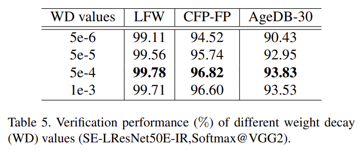 Weight decay. SE-LResNet50 E-IR 네트워크를 기반으로 중량 감소(WD) 값이 검증 성능에 어떤 영향을 미치는지도 살펴본다. 표 5에서 볼 수 있듯이 체중 감량 값이 5e - 4로 설정되면 검증 정확도가 가장 높은 지점에 도달한다.