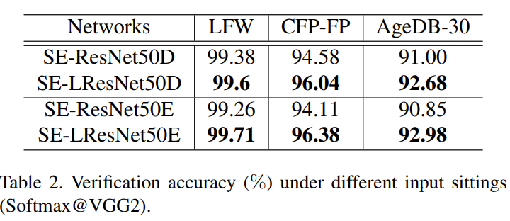Network. VGG2를 교육 데이터로 사용하여 컨볼루션 네트워크 설정과 관련된 광범위한 대조 실험을 수행하고 LFW, CFP 및 AgeDB에 대한 검증 정확도를 보고한다. 제안된 네트워크 설정은 큰 포즈 및 연령 변화 하에서 견고하게 확인되었다. 가장 최근의 네트워크 구조를 기반으로 속도와 정확성 사이의 절충을 탐구한다.