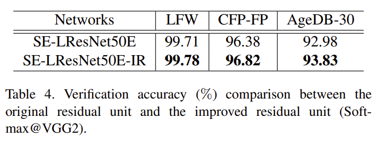 Block selects IR. 표 4에서는 원래 잔차 단위와 개선된 잔차 단위를 비교 결과에서 알 수 있듯이 제안된 BN-Conv(strid=1)-BN-PReLu-Conv(strid=2)-BN 유닛은 검증 성능을 분명히 개선할 수 있다.