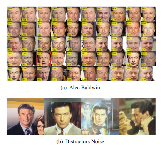 그림 6(b)에서는 메가페이스 산란기에서 나오는 노이즈 얼굴 이미지 예를 제공한다. 메가페이스 산만기에서 나온 네 개의 얼굴 이미지는 모두 알렉 볼드윈이다. 메가페이스 산란기를 수동으로 청소하고 마침내 707개의 시끄러운 얼굴 이미지를 발견한다.