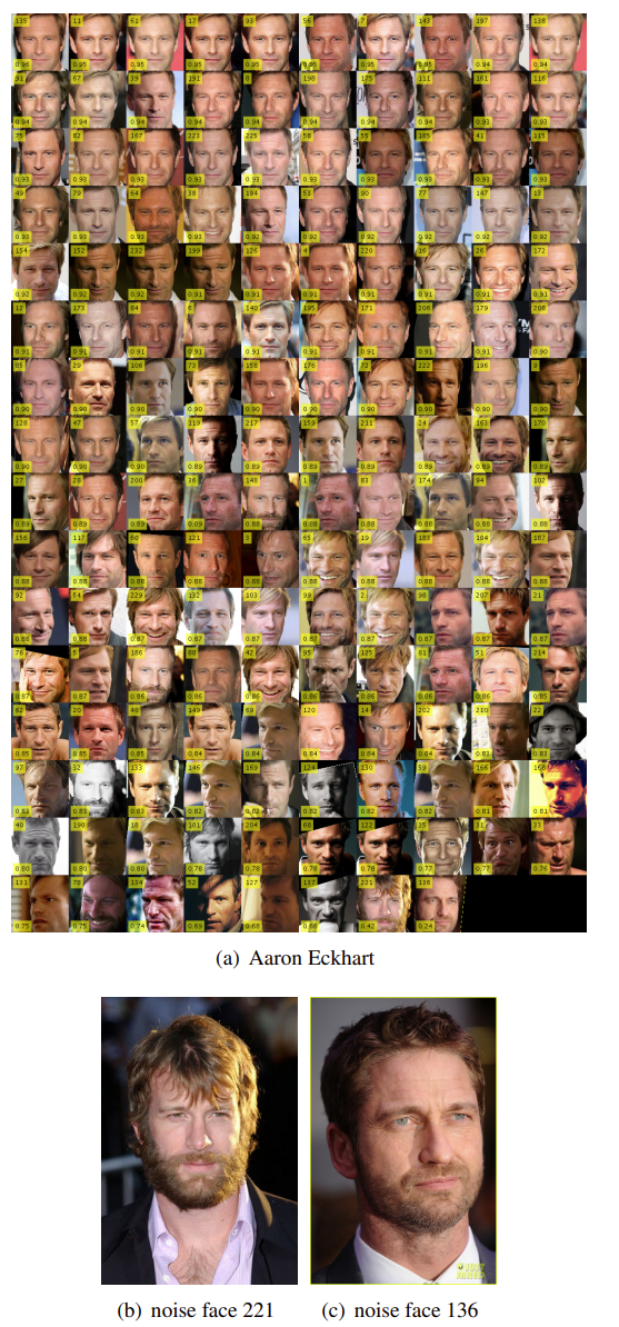 그림 8(c)에 표시된 것처럼, 모든 면의 아이덴티티 센터까지의 코사인 거리에 따라 순위를 매긴다. 사실, 얼굴 이미지 221과 136은 아론 에크하트가 아니다.