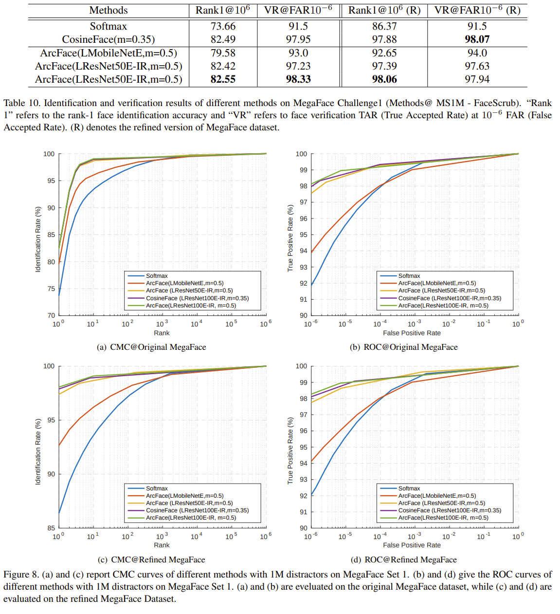 정제된 메가페이스 테스트 세트에서 코사인 페이스의 검증 결과는 아크 페이스보다 약간 높다. 이는 개발 키트의 출력에서 FAR=1e-6에 가장 가까운 검증 결과를 읽기 때문이다. 그림 8에서 볼 수 있듯이, 제안된 ArcFace는 식별 및 검증 메트릭 모두에서 항상 CosineFace를 능가한다.