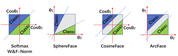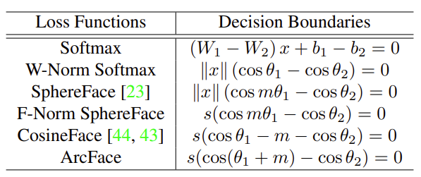 소프트맥스에서 제안된 아크 페이스까지의 프로세스를 더 잘 이해하기 위해 표 1과 그림 3의 이진 분류 사례에 따라 결정 경계를 제공한다. 가중치와 특징 정규화에 기초하여, 이러한 방법의 주된 차이점은 여백을 어디에 두느냐이다.