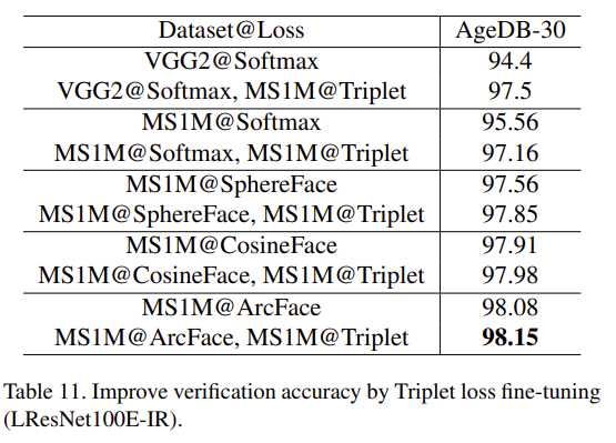 (1) ID 번호가 적은 데이터 세트(예: 8,631개의 ID를 가진 VGG2)에서 훈련된 소프트맥스 모델은 ID 번호가 더 많은 데이터 세트(예: 85k ID를 가진 MS1M)에서 트리플트 손실 미세 조정을 통해 분명히 개선할 수 있다. 이 개선은 2단계 훈련 전략의 효과를 확인하며, 이 전략은 처음부터 트리플릿 손실을 훈련하는 것에 비해 전체 모델 훈련을 크게 가속화할 수 있다.