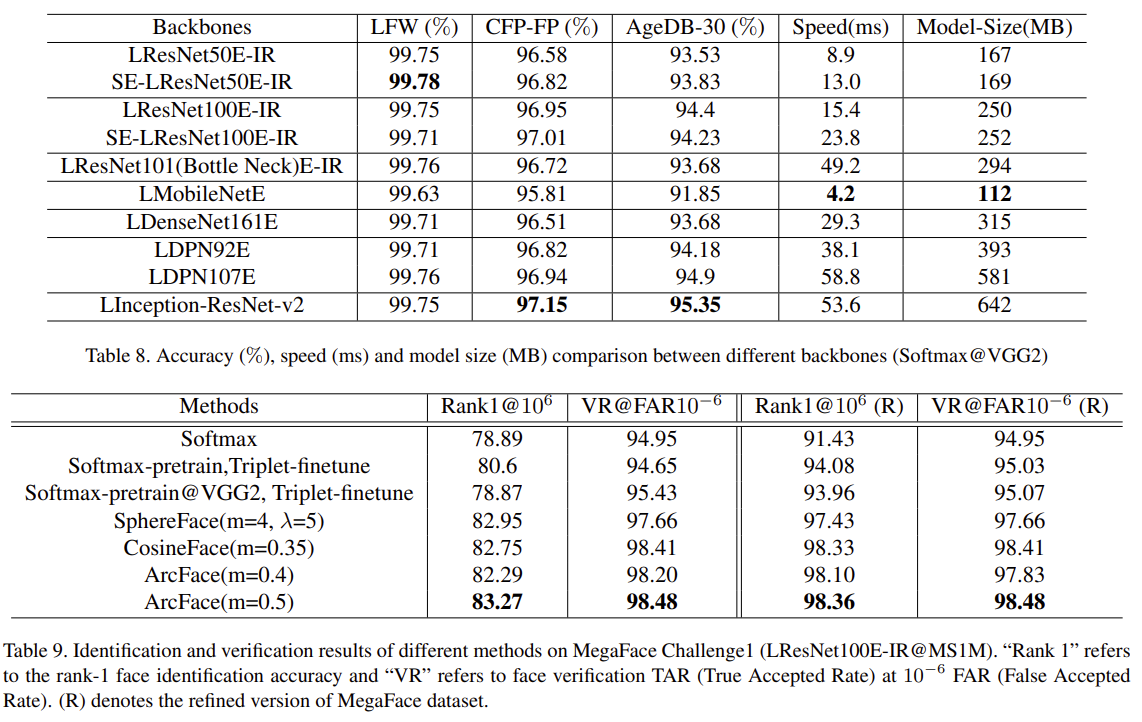 Backbones Comparisons. 표 8에서는 다양한 백본의 검증 정확도, 테스트 속도 및 모델 크기를 제공한다. LFW의 성능이 거의 포화 상태이기 때문에, 이러한 네트워크 백본을 비교하기 위해 더 어려운 테스트 세트인 CFP-FP와 AgeDB-30에 초점을 맞춘다. Inception-Resnet V2 네트워크는 긴 실행 시간(53.6ms)과 가장 큰 모델 크기(642MB)로 최고의 성능을 얻는다. 반면 모바일 넷은 112MB 모델로 4.2ms 이내에 얼굴 피처 임베딩을 마칠 수 있고 성능은 소폭 하락할 뿐이다.