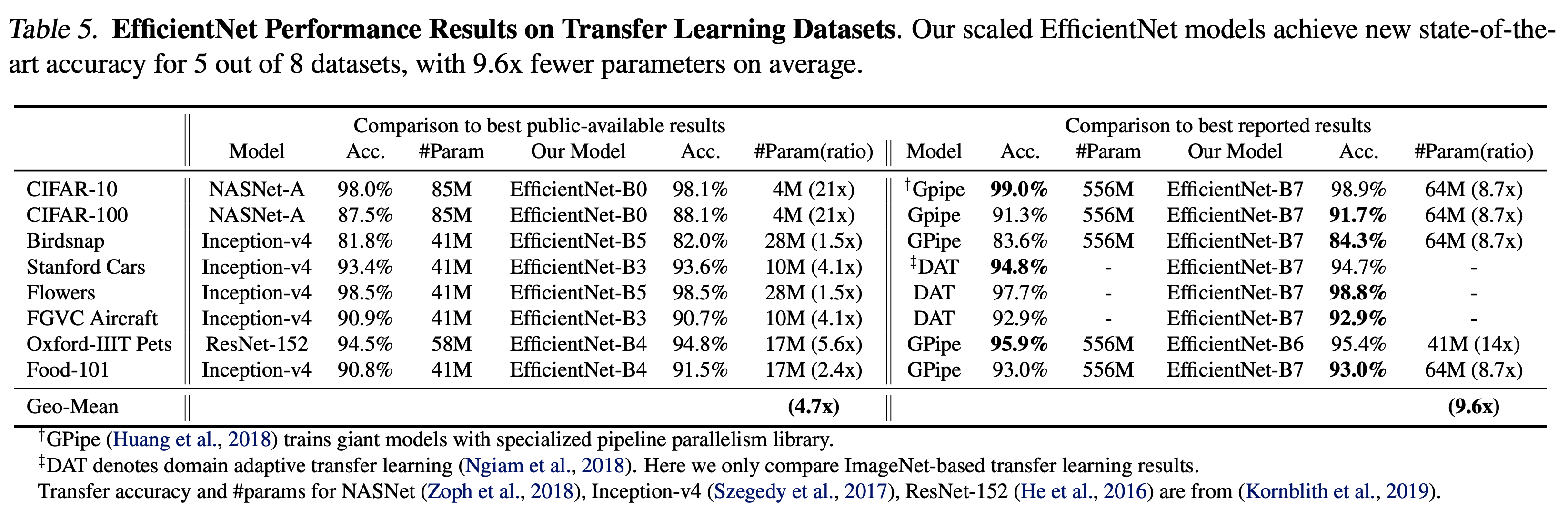 - Table.5 는 NASNet-A 와 Inception-v4 등 다른 모델과의 transfer learning 성능을 비교한다.