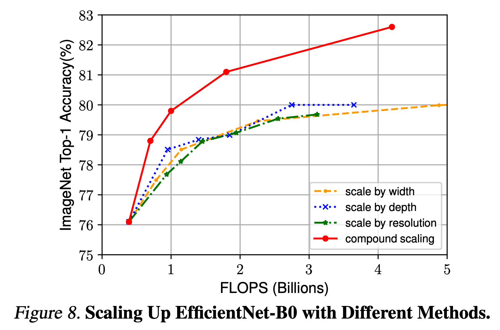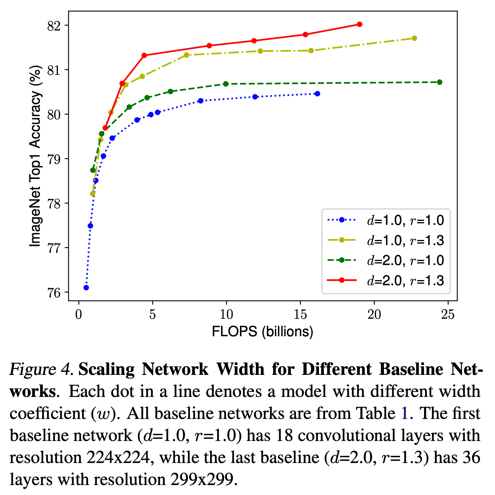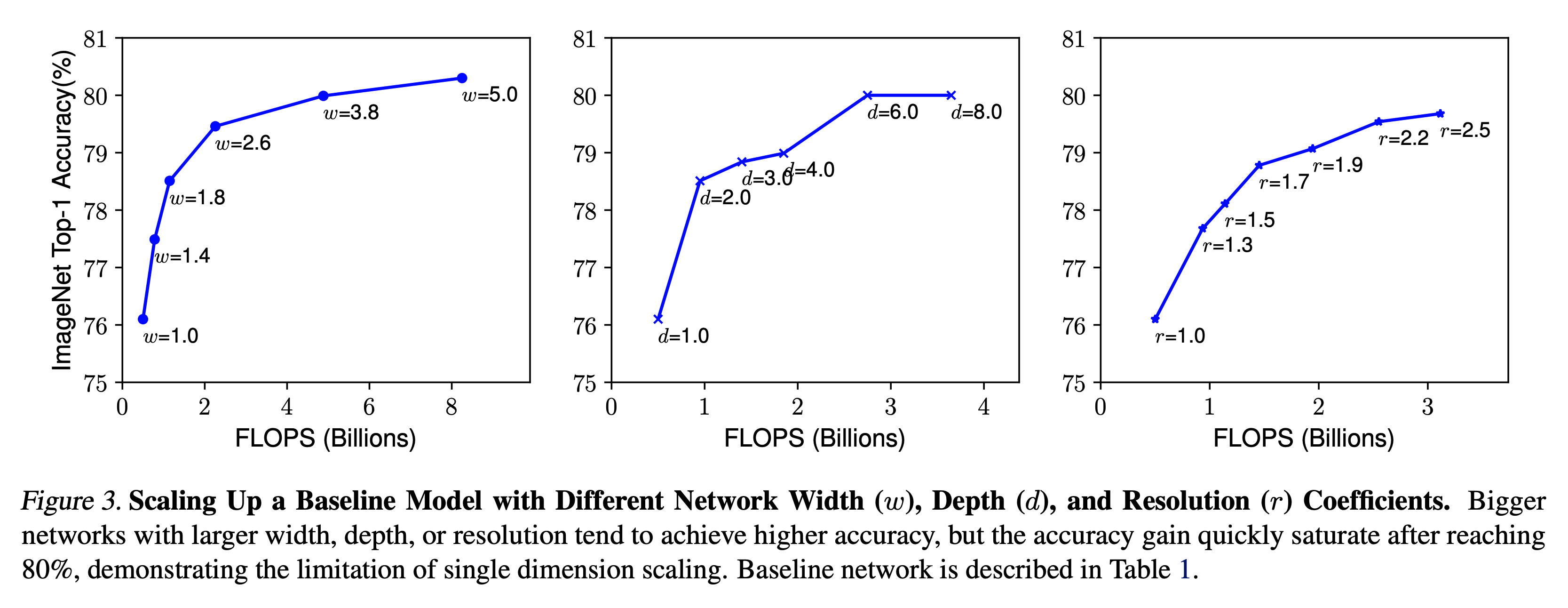 - 동일한 FLOPS 에서 width/depth/resolution 조합에 따라 다양한 성능 차이를 보이게 된다.
